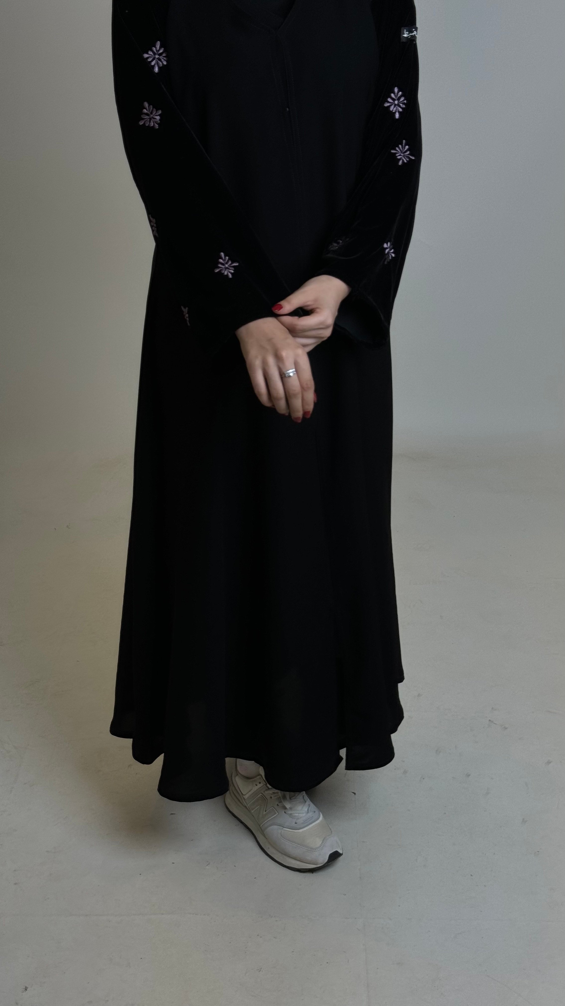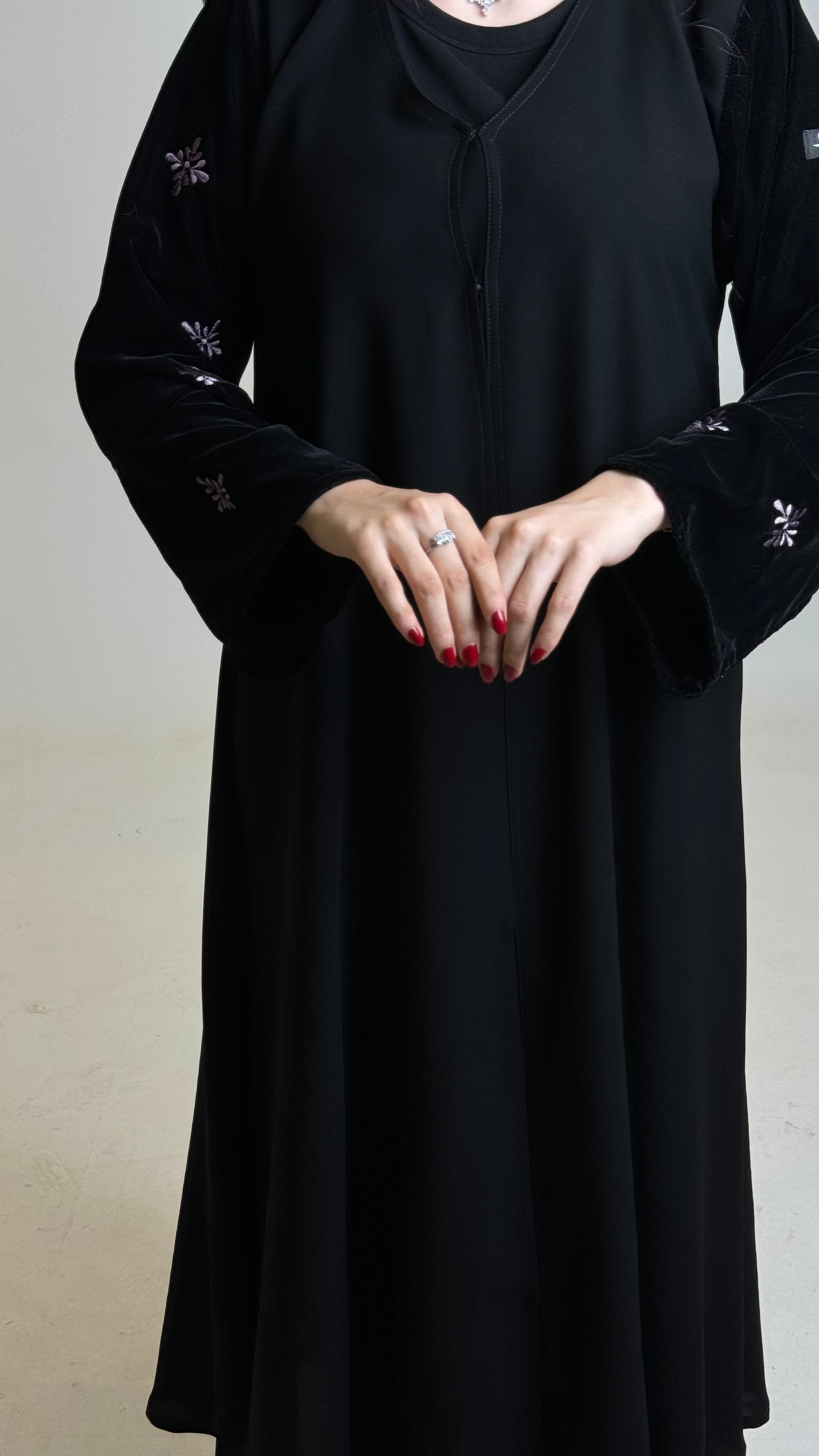 عباية لينا الأنيقه بقصه ( نص كلوش ) باكمام مخمل مطرزه ومنسوجة بخيط يدوي لتمنحكِ اطلالة أنيقه ومميزه